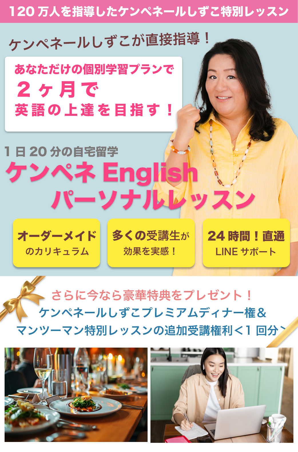 私があなただけの学習プランを作成し、1対1の個別指導を行い、2ヶ月で英語をスラスラと話すことを目指すプログラムです。